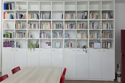 Cette bibliothèque comprend des ouvrages de références et productions scientifiques du service, ainsi que des documents et du matériel utilisables aussi bien pour la recherche que l’enseignement. Elle est équipée d’un large écran tactile et de moyens permettant d’organiser des visio-conférences. Elle permet, grâce à ses tables modulaires, de proposer des configurations très variées permettant l’accueil d’une vingtaine de personnes, avec une très jolie vue sur le parc et une lumière naturelle agréable.