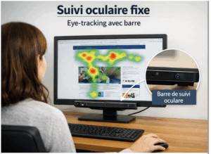 Le laboratoire d’eye-tracking fixe est dédié à l’enregistrement et à l’analyse des mouvements oculaires. Il mesure en temps réel les trajectoires du regard, les fixations et les saccades face à un stimulus visuel présenté sur écran. Ces données permettent d’identifier où le participant regarde, pendant combien de temps et dans quel ordre.